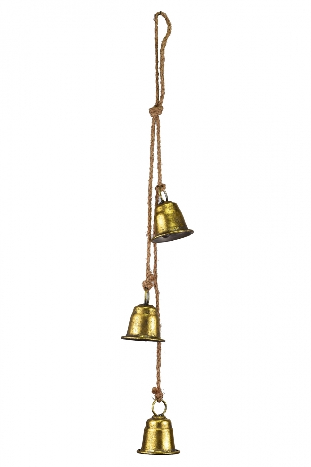 Tři zlaté kovové zvonky na jutovém provaze 7x5,8x63 cm