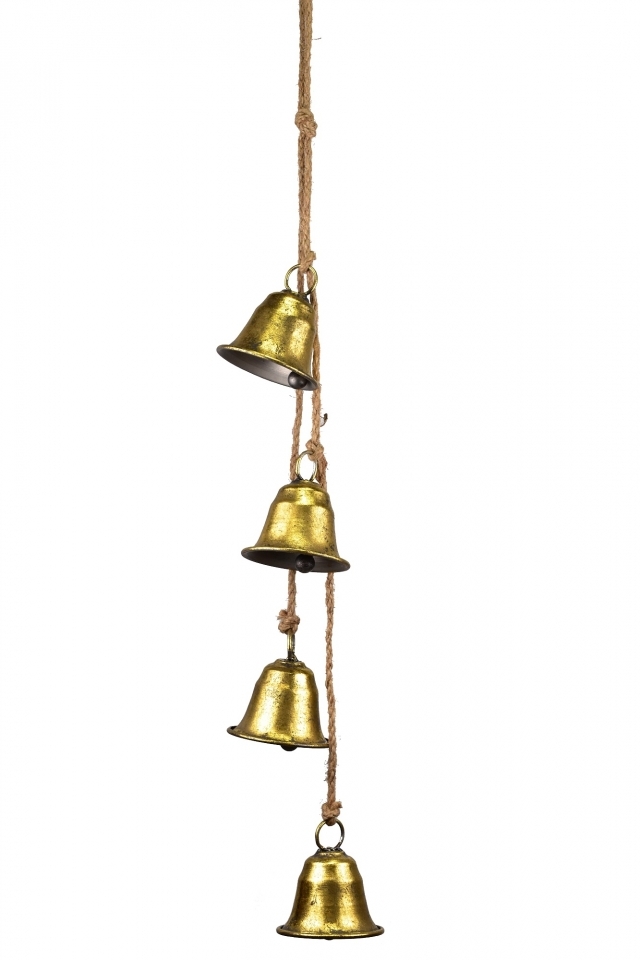 Čtyři zlaté kovové zvonky na jutovém provaze 8x7,3x75 cm