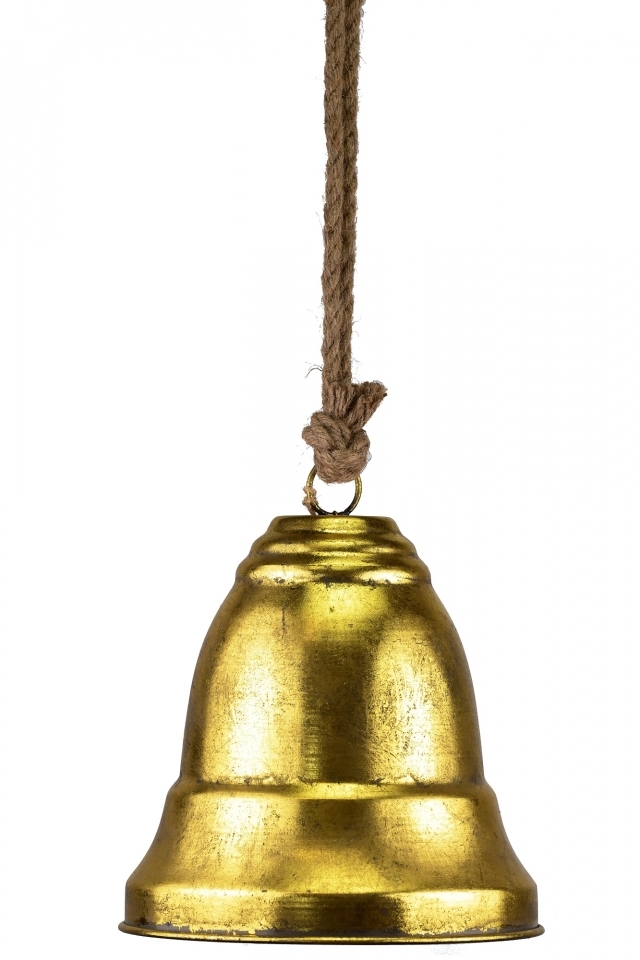 Kovový zvonek zlatý s patinou na jutovém provaze 23x23,5 cm