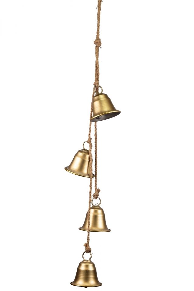 Čtyři staro-zlaté kovové zvonky na jutovém provaze 8x7,3x75 cm