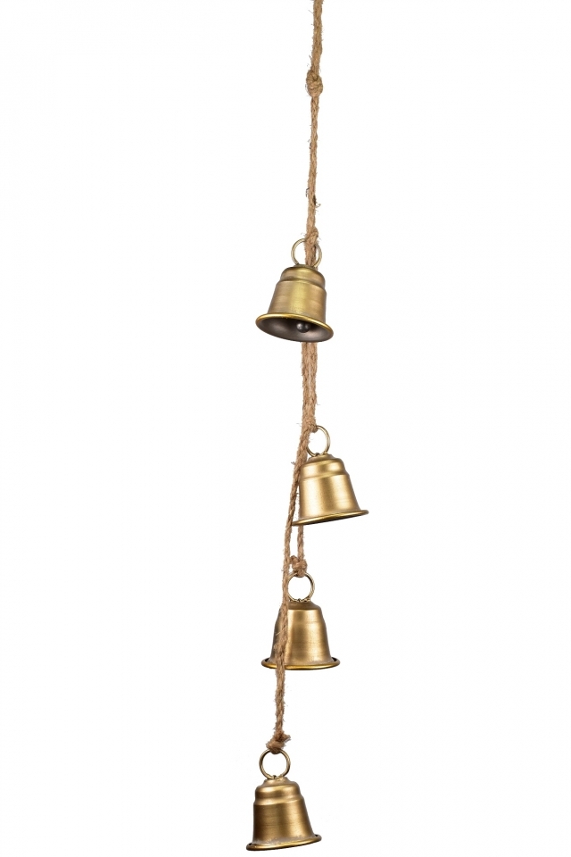 Čtyři staro-zlaté kovové zvonky na jutovém provaze 7x5,8x75 cm