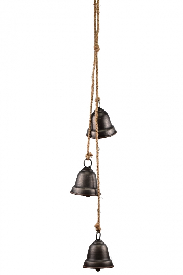 Tři šedé kovové zvonky na jutovém provaze 9x7,7x63 cm
