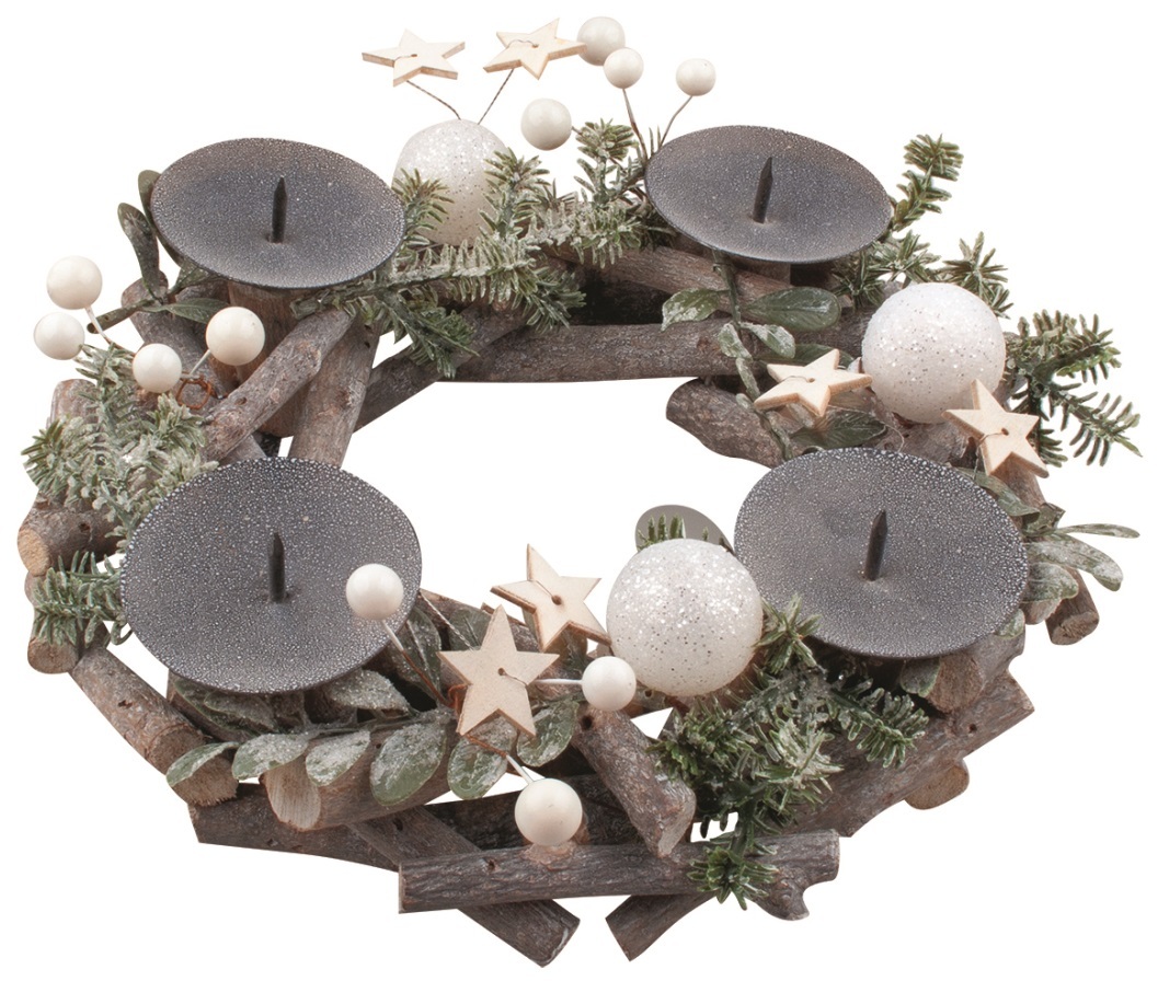 Tento adventní věnec má průměr 23 cm a je vyroben z kvalitních větviček zdobených šiškami, bílými kuličkami a drobnými dekoracemi. Jeho přirozený vzhled s přírodními motivy se hodí téměř do každého stylu interiéru a zaručuje opakované použití rok co rok.