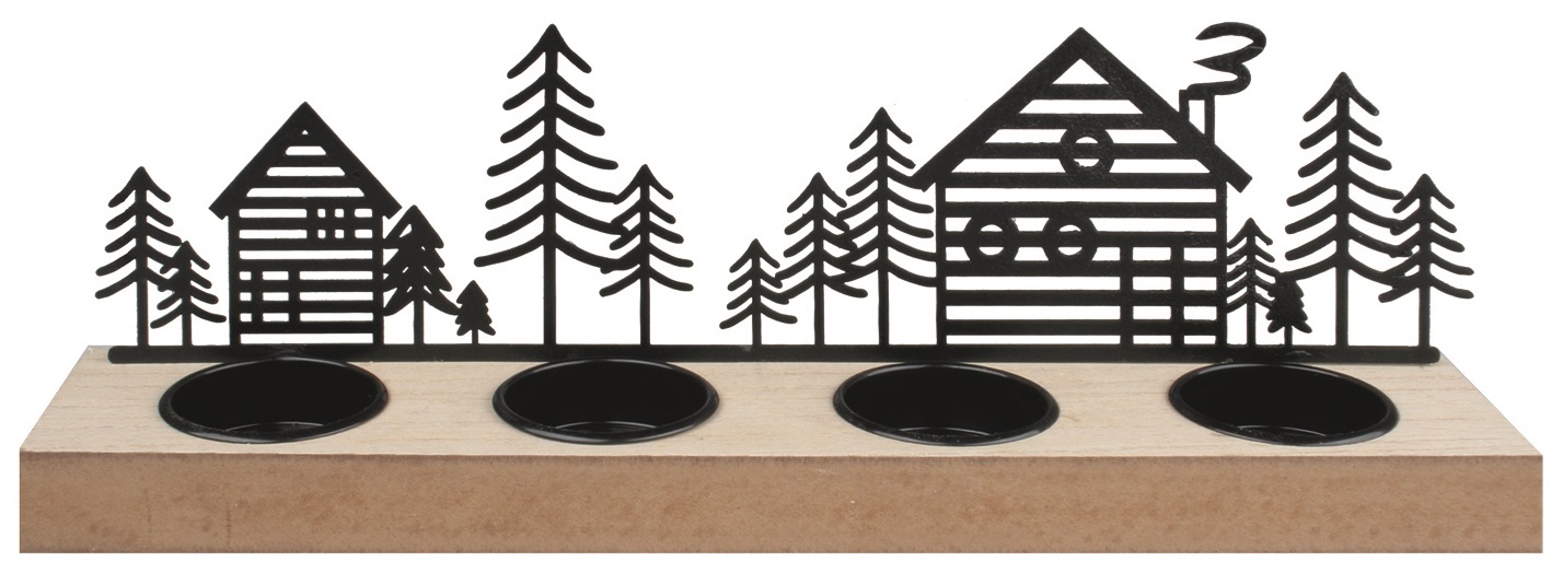 Dřevěný základ svícnu vytváří pevnou a stabilní oporu, zatímco čtyři kovové domečky v černé barvě skvěle zvýrazní plamínek klasických čajových svíček. Tento design se perfektně hodí nejen na vánoční období, ale i jako stylový dekorativní prvek během celého roku.
