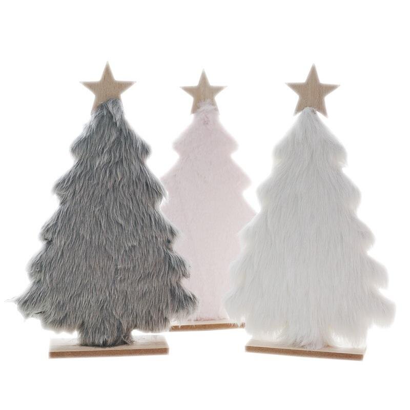 Drewniana dekoracja stojąca - choinka z miękkim, kolorowym futerkiem. Oryginalna, wysoka świąteczna dekoracja. Ozdoba wprowadza świąteczną atmosferę w pomieszczeniu, nie zajmuje wiele miejsca - łatwo ustawić na półce, stoliku lub regale. Dostępne różne wersje kolorystyczne futerka na choince....