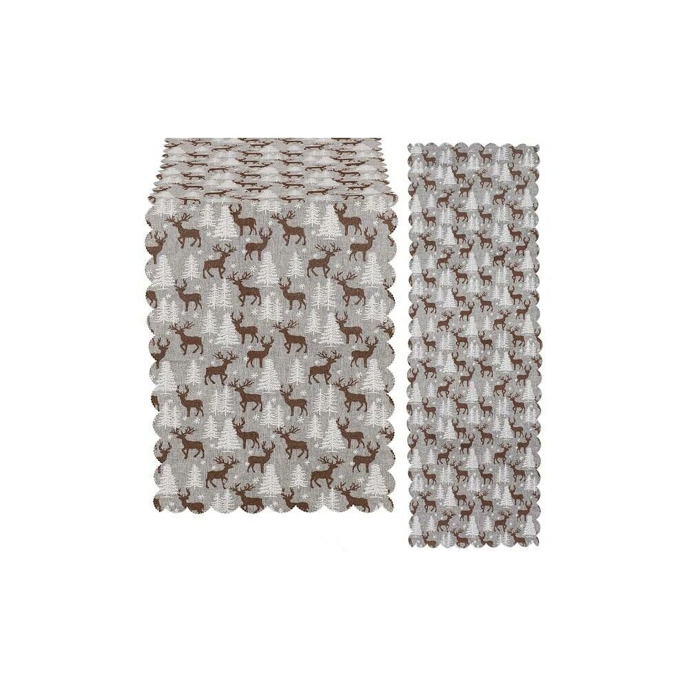Vánoční ubrus 186x35 cm Sobi a Stromky, šedo-hnědý