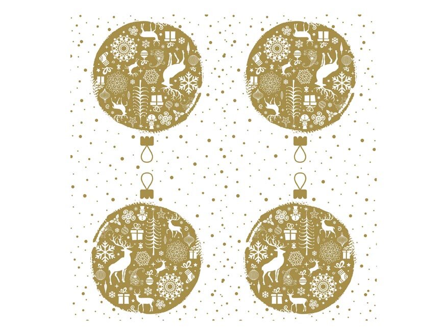 Papírový vánoční ubrousek v bílé barvě. Ubrousek je kvalitní z třívrstvého papíru s motivem zlatých vánočních baněk. Vytvořeni decentní vánoční atmosféry stojí na maličkostech. I taková drobnost, jako vánoční ubrousky změní ráz vašeho stolování.