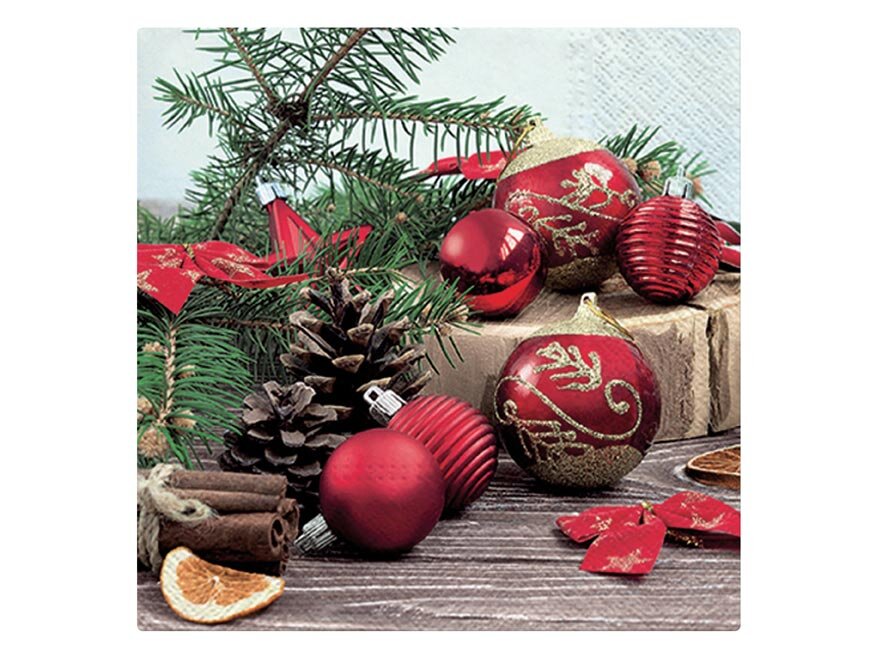 Papírový vánoční ubrousek s motivem šišek, ozdob a větviček jehličí. Je vyroben z velmi kvalitního třívrstvého papíru. Tento ubrousek je ideální pro vánoční stolování, kde jeho tradiční dekorace a barvy přispějí k vytvoření sváteční atmosféry. Hodí se k jakékoliv příležitosti během svátků, ať už jde o rodinnou večeři nebo sváteční setkání.