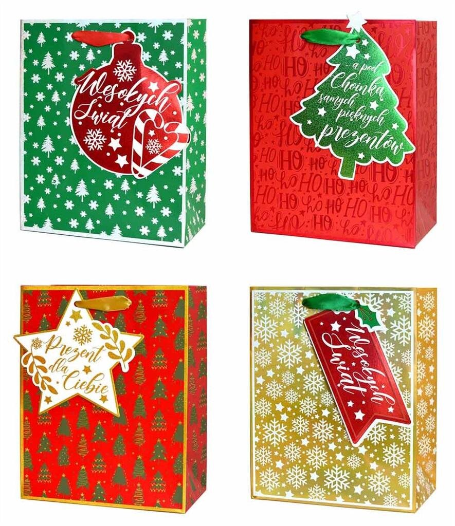 Cechy szczególne: typ produktu: torba na prezent, zdobienie: metaliczna folia, ozdobna zawieszka, wielkość orientacyjna: 33 x 45,6 x 15 cm (szerokość x wysokość x głębokość), okazja: Boże Narodzenie