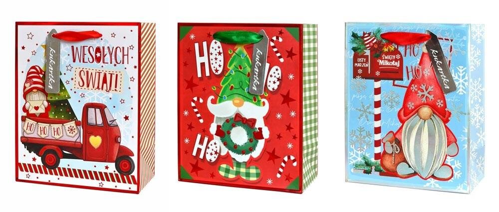 Cechy szczególne: typ produktu: torba na prezent, zdobienie: metalizowana, kolorowa folia, wielkość: 26 x 32,3 x 12,5 cm okazja: Boże Narodzenie
