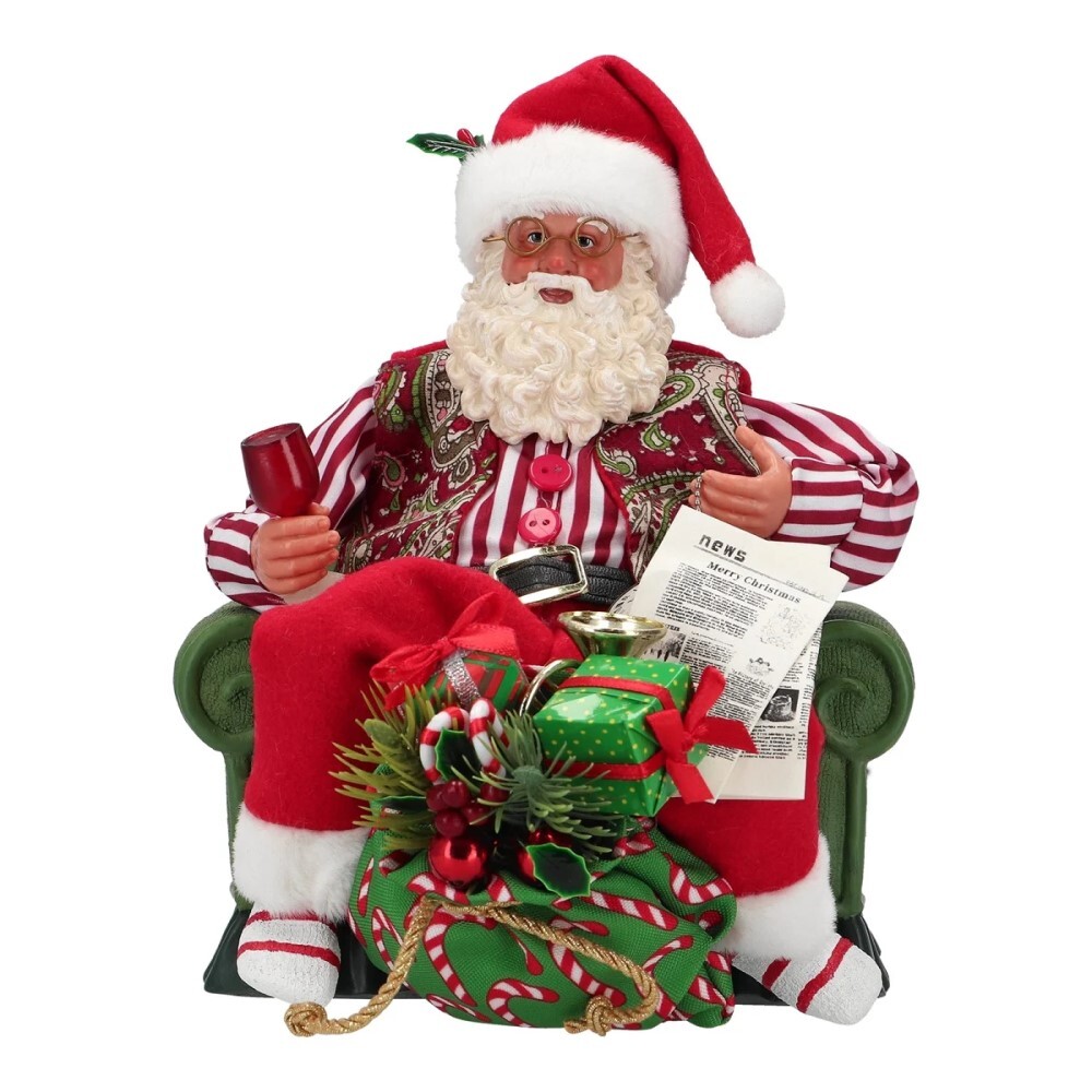 Detailně propracovaná figurka Santu s kalichem a dárky sedícího v křesle s rolničkou.
