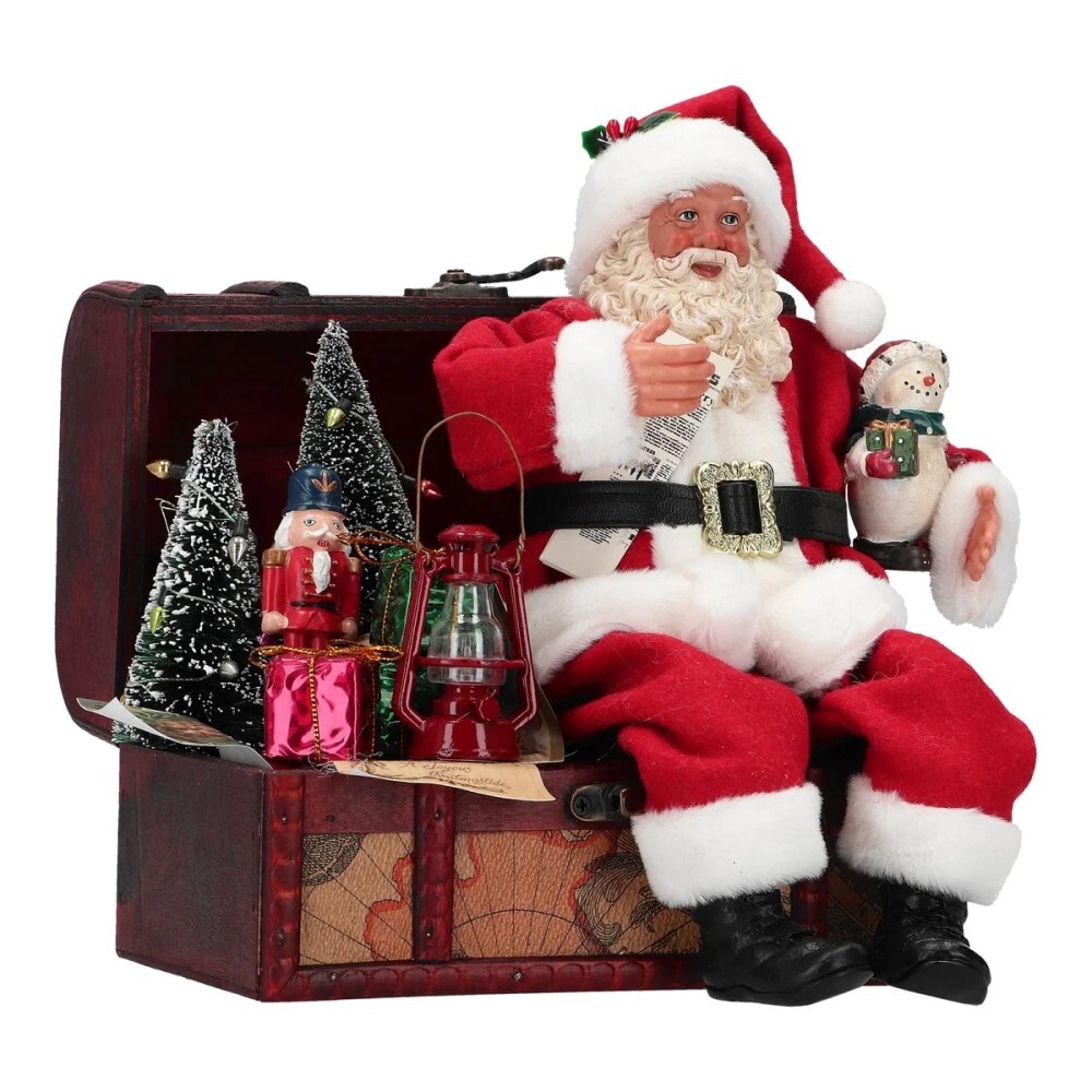 Vánoční dekorace Santu sedícího na kufru s dárky a figurkami.