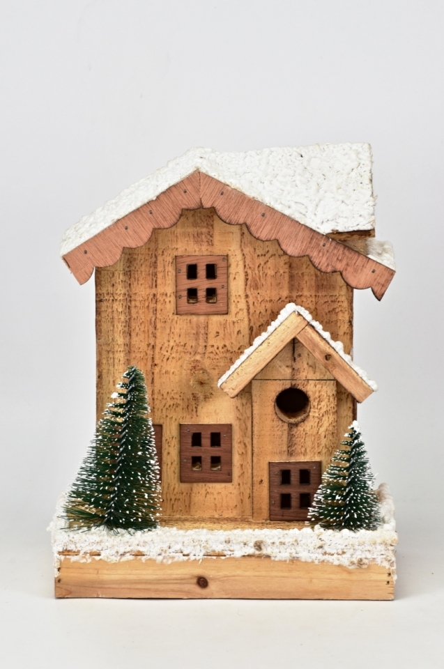Doplňte vaši vánoční výzdobu výjimečným dřevěným domkem s LED osvětlením. Zaujme vás svou zasněženou střechou a stromky. Napájení pomocí baterií 2xAA.