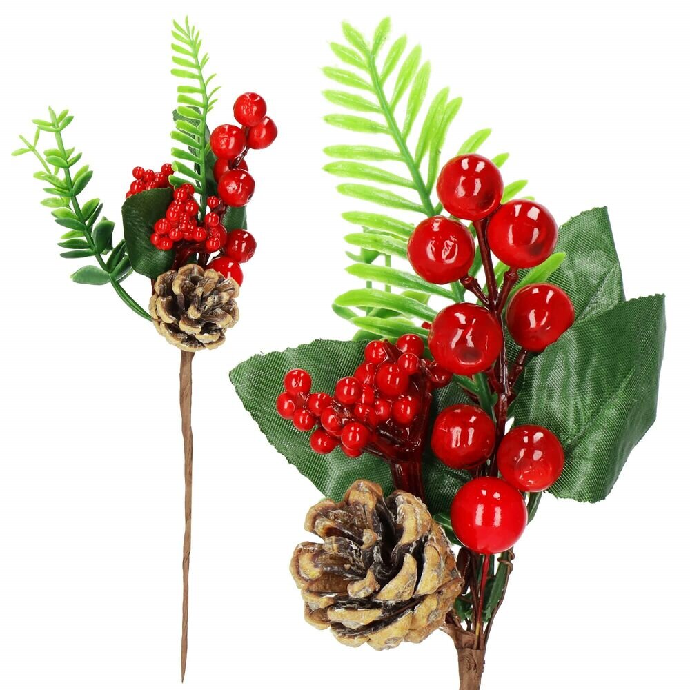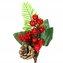 Bohatě zdobená větvička s bobulemi červených jeřabin, zelenými lístky a šiškou. Zúžený konec pro snadné zapíchnutí. Výška 28 cm, šířka 11 cm. Překrásná dekorace, která může být použita samostatně nebo jako prvek větších aranžmá. Vhodná pro vnitřní i venkovní použití.