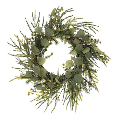 Velký zelený věnec s kombinací eukalyptu a jehličí přinese do vašeho domova svěží přírodní vzhled. Jemný design a precizní detaily dokonale napodobují skutečné rostliny. Skvělá dekorace na dveře, stěnu i stůl.