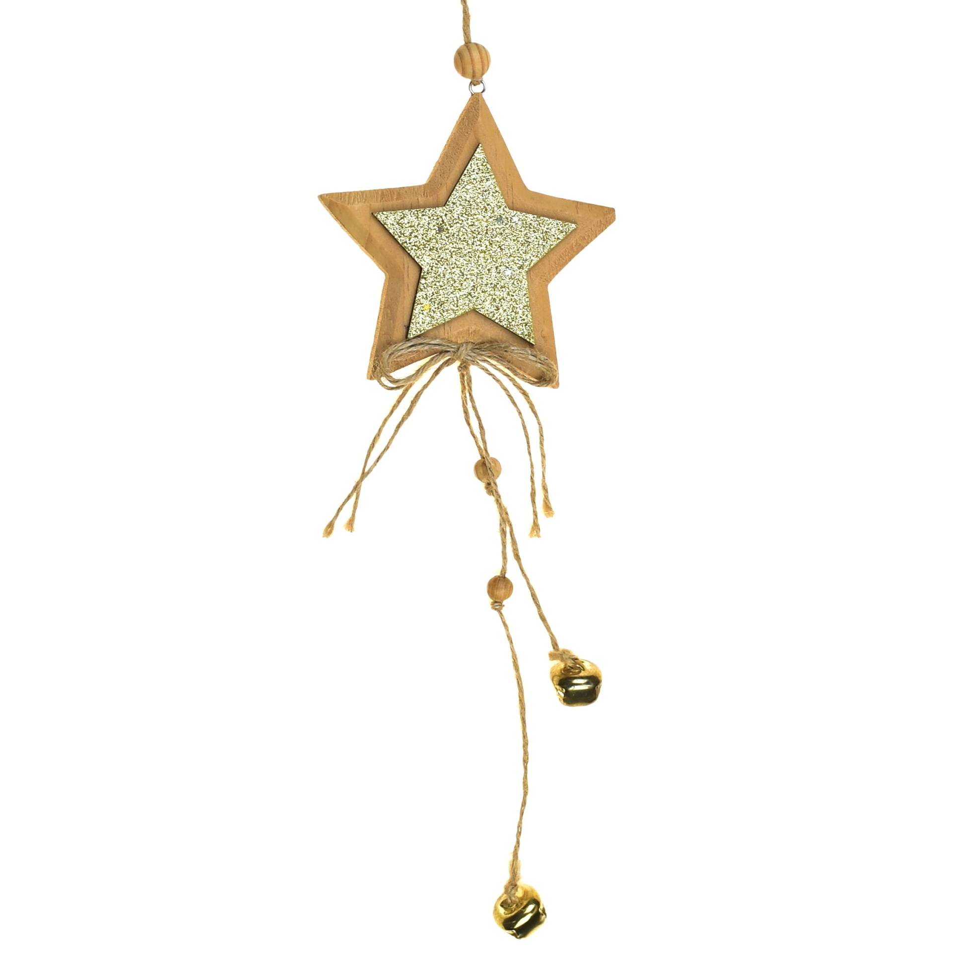 Závěsná hvězda zlatá s rolničkami je perfektní dekorace pro každou příležitost! Tato dřevěná hvězda se zlatým dekorem a rolničkami je skvělým doplňkem vašeho interiéru.
