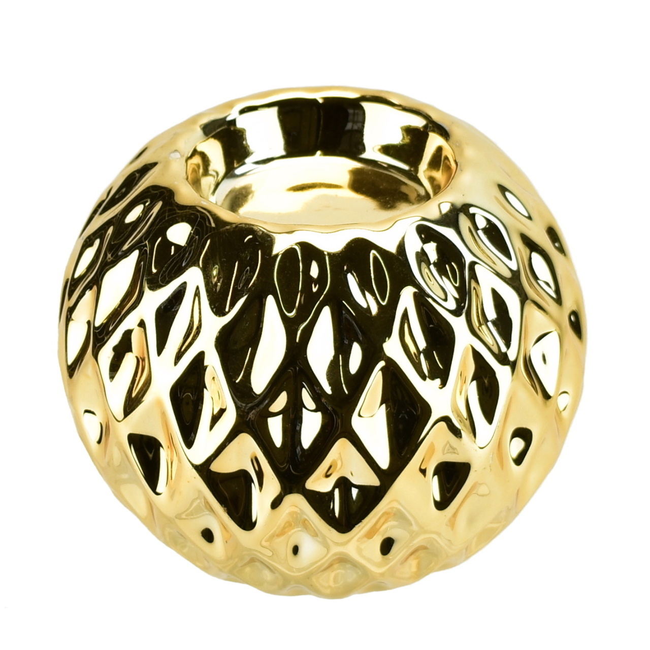 Svícen zlatý vroubkovaný 7x9 cm je elegantní přídavek k vašemu domovu či kanceláři. Tento keramický svícen zaujme svým vroubkovaným designem a zlatým lesklým povrchem. Svícen je vhodný pro umístění čajové svíčky a přidá útulný prvek do vašeho prostoru.