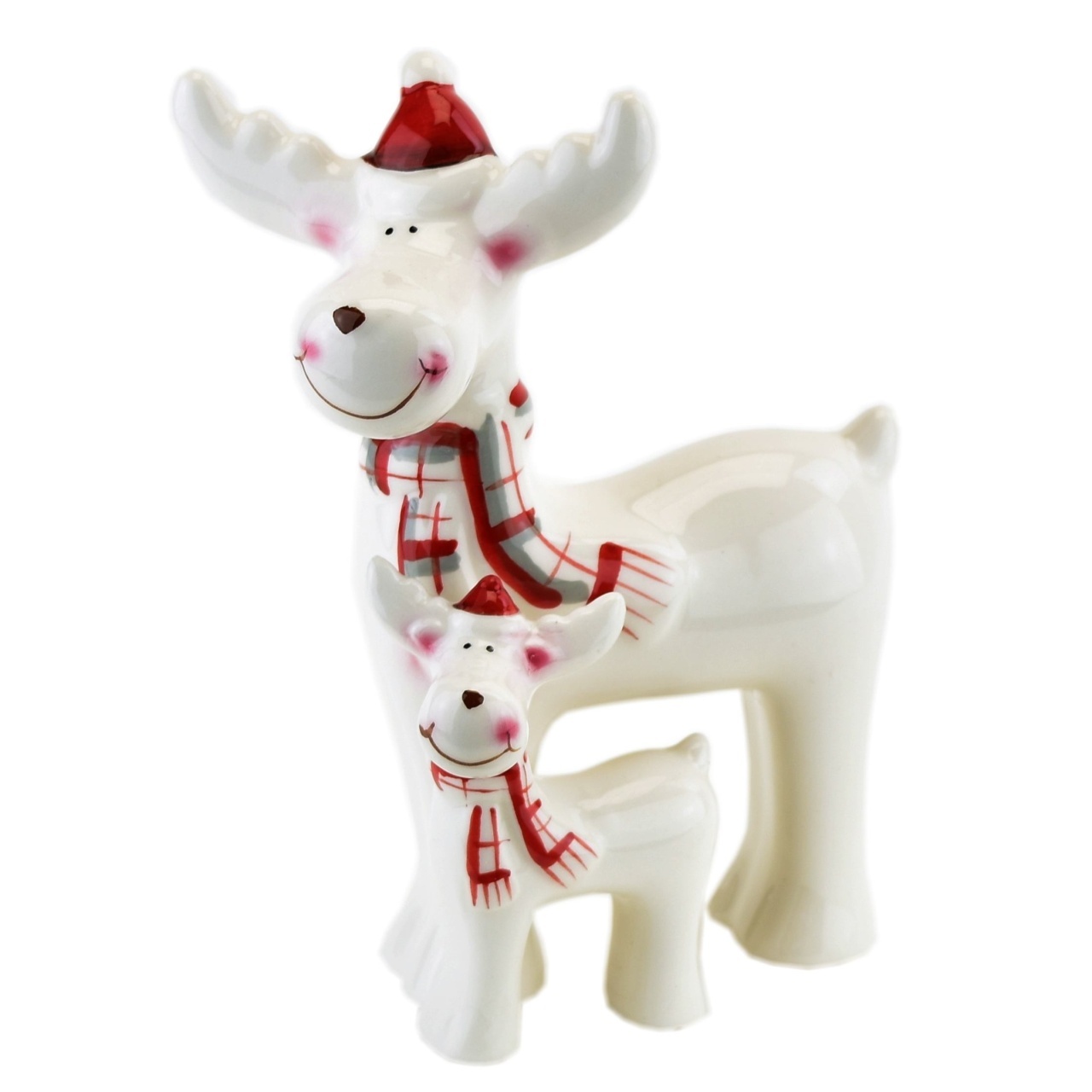 Roztomilý bílý keramický sob se sobíkem s červenou čepičkou a šálou!