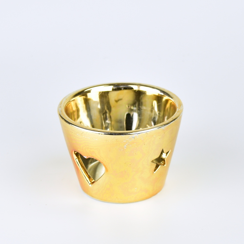 Svícen keramický zlatý na čajovou svíčku s výřezy hvězdiček a srdíčka. číst celé