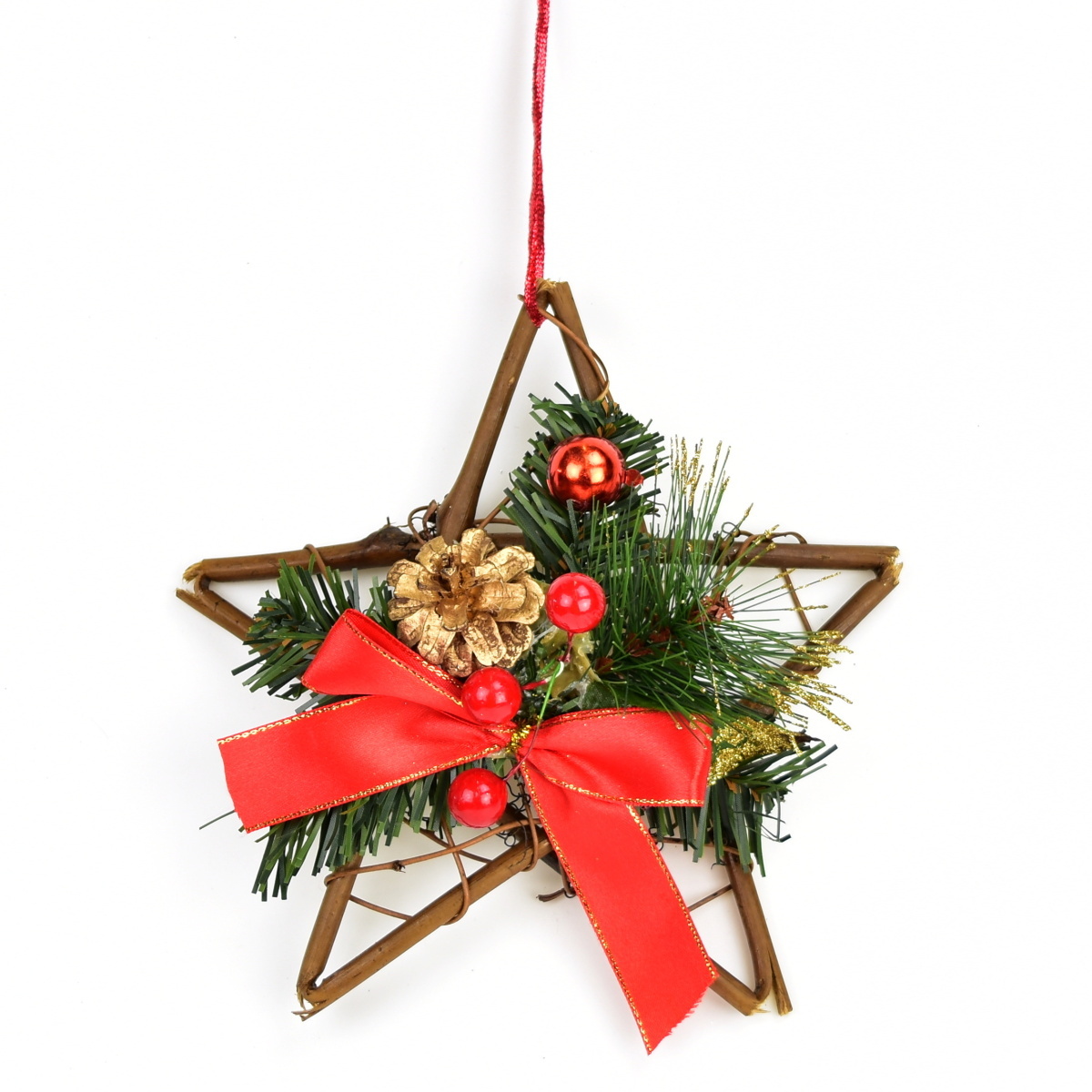 Oživte své vánoční dekorace s naší proutěnou závěsnou hvězdou s elegantní červenou mašlí. S rozměry 20 x 20 cm je tento stylový kousek ideální pro ozdobení vašeho domova během svátků. Hvězda je zdobena šiškami, kouličkami a bobulemi, které dodávají nádech přírodní krásy a kouzla Vánoc. Tento výrobek je nejen skvělou volbou pro vaše vánoční výzdoby, ale také přináší útulnost a teplo do každé místnosti.