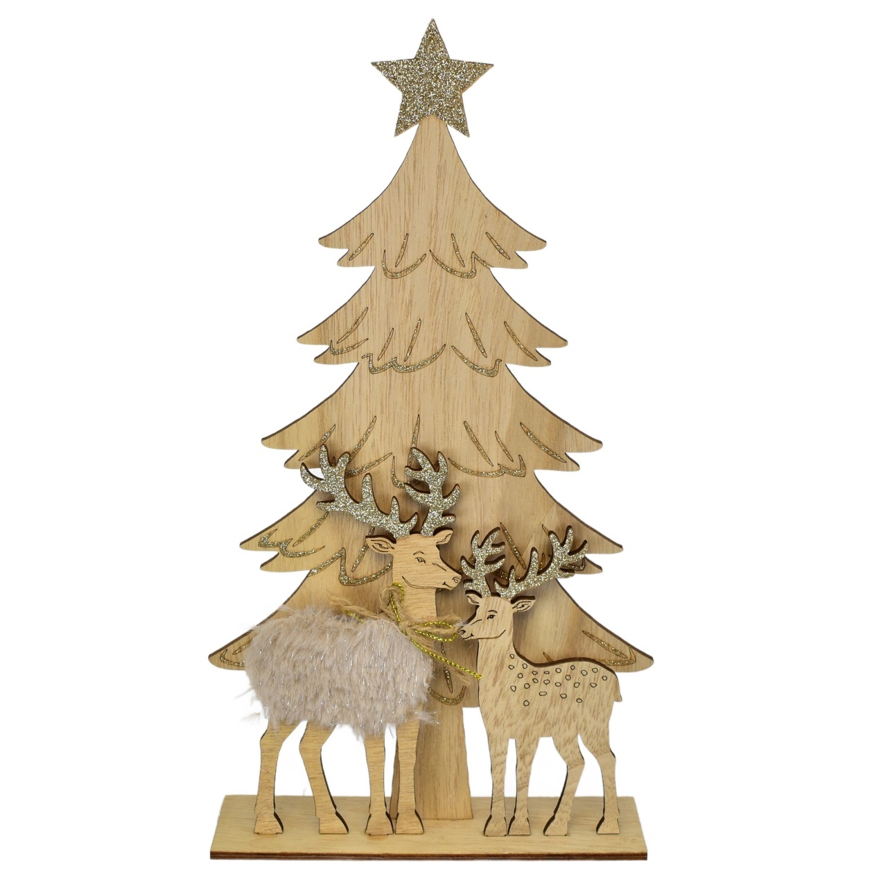 Oslňte své hosty a přidejte do vašeho vánočního dekorování kousek kouzla s naším dřevěným stromkem se srnkami. Tento jedinečný kousek dosahuje výšky 33 cm a šířky 18 cm, což z něj činí ideální dekoraci pro vánoční stoly, okna nebo rovnou do obývacího pokoje. Každý detail je pečlivě navržen - zlatá třpytivá hvězda na vrcholu a stříbrné třpytivé parohy srnek dodávají výrobku na noblese a výjimečnosti.