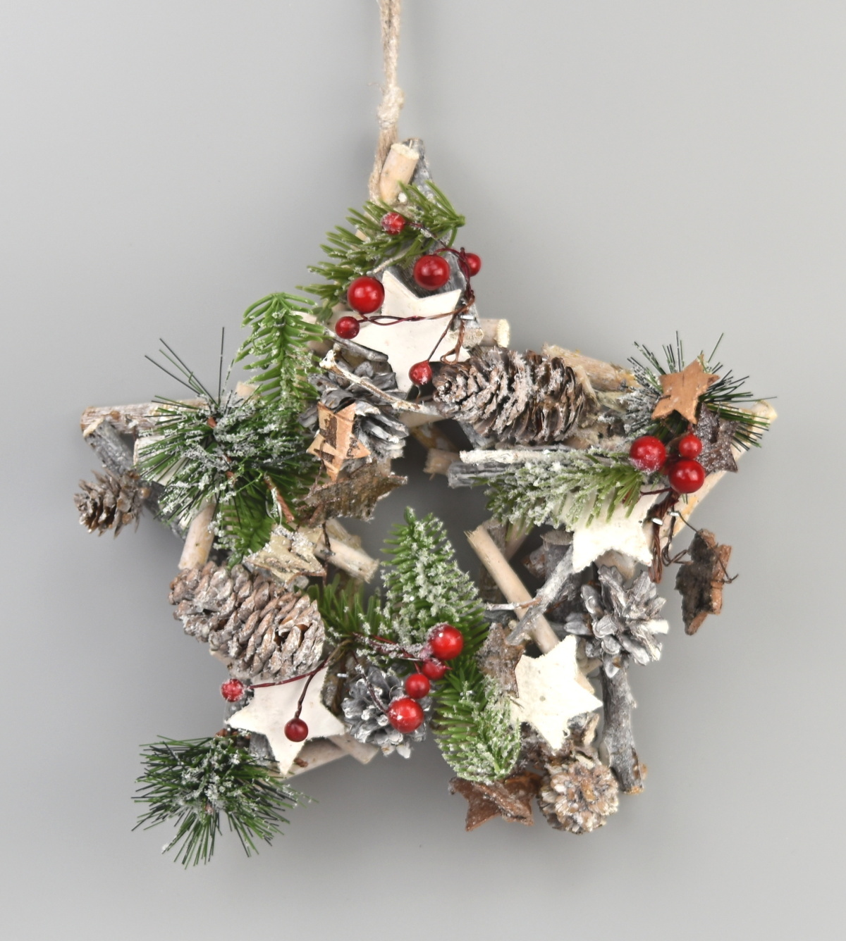 Hvězda závěsná z dřívek a proutí, doplněný šiškami, bezinky,hvězdičkami a zasněženým chvojím. číst celé