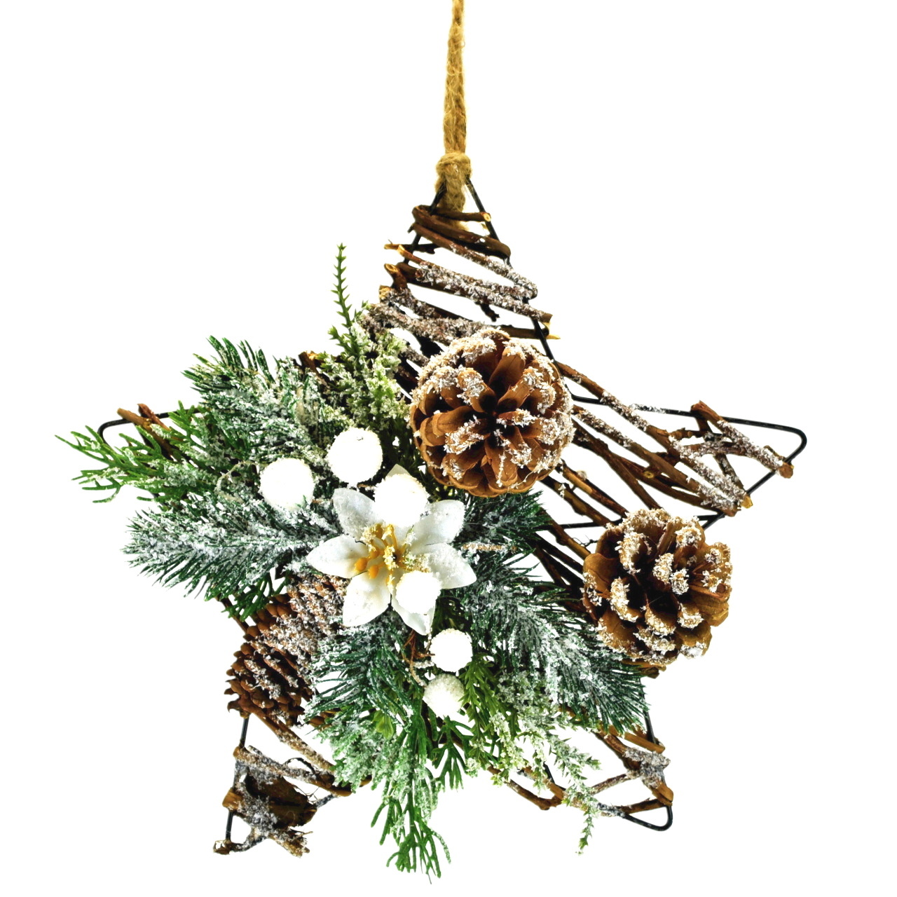 Vyrobte si vánoční atmosféru s touto krásnou proutěnou hvězdou! Ručně vyrobená hvězda je zdobená bílou poinsetií, zelenými větvičkami, šiškami a bílými bobulemi. Je jemně zasněžená, takže vás ihned vtáhne do vánoční nálady. Ať už ji pověsíte na stromek, na dveře nebo na okno, určitě bude vypadat úžasně!