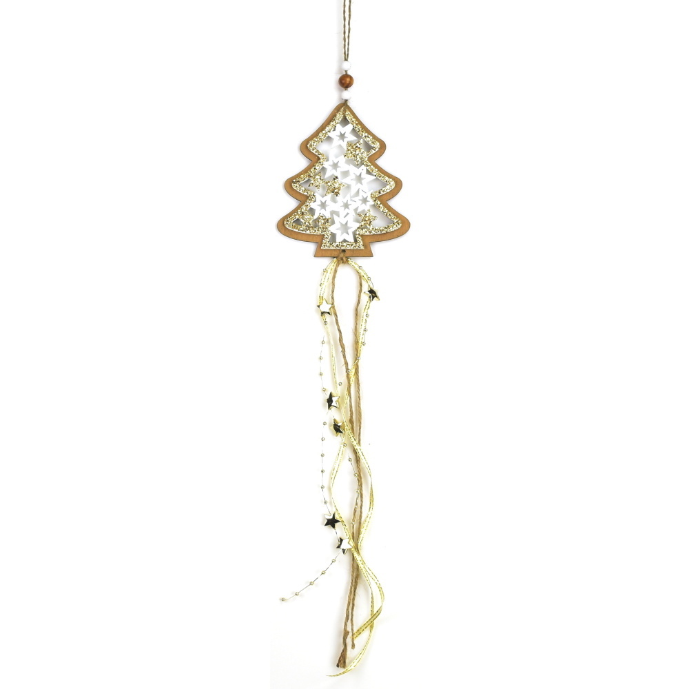 Dřevěný závěsný stromek je krásným doplňkem pro vánoční atmosféru ve vašem domě. Je vyroben z kvalitního dřeva a zdobený zlatým glitrem, který dodává stromku elegantní lesk. Svítící řetízek a mašle dodávají dekoraci ještě větší kouzlo.