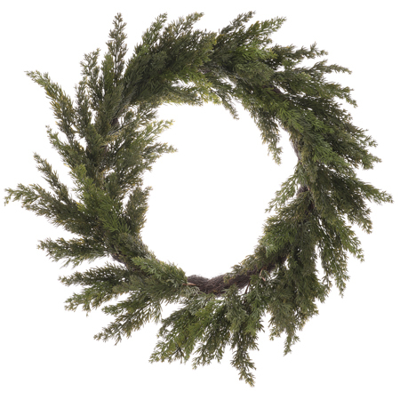 Velký umělý věnec o průměru 66 cm, tvořený realisticky zpracovaným zeleným jehličím túje. Působí bohatým a svěžím dojmem, neopadává a zůstane krásný po mnoho sezón. Ideální jako výrazná zimní dekorace nebo základ pro další zdobení dle vaší fantazie.