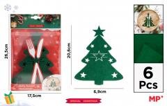 Kształt: choinka (17x21cm). Wykonane z filcu o grubości 2 mm, starannie wyciętego w kształty choinki i gwiazdy. Lekki, elastyczny i sprężysty materiał, który chroni naczynia przed zarysowaniami i poślizgiem. Wielokrotnego użytku, trwały i odporny na zagniecenia. Każdy zestaw zawiera 6 sztuk + parę kartonowych sztućców, wszystkie zapakowane w torbę OPP.