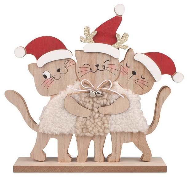 Kočky v červených čepicích, dřevěné na postavení, 23,5 x 22 x 4 cm Tyto dřevěné kočky v červených čepicích jsou roztomilou a veselou dekorací, která vnese do vašeho domova hřejivou zimní atmosféru. Sváteční čepičky a přívětivý výraz z nich dělají ideální doplněk nejen pro vánoční období, ale i pro celou zimní sezónu Využití: Skvěle se hodí na komodu, parapet nebo polici. Díky větší velikosti se stanou výrazným prvkem vašeho interiéru, ať už samostatně, nebo jako součást většího aranžmá. Vlastnosti: rozměry: 23,5 x 22 x 4 cmmateriál: dřevostabilní základna pro postaveníTyto dřevěné kočky s čepicemi rozzáří každý prostor a přinesou do domova radost a pohodu.