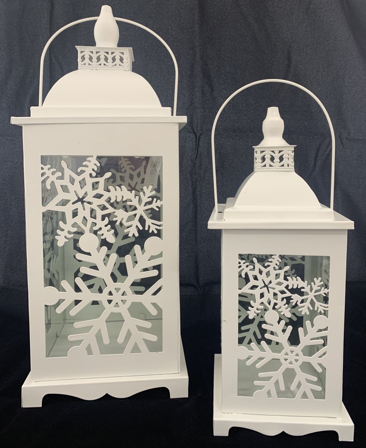 Kovové lucerny prosklené se sněhovými vločkami - sada 2ks. Cena za sadu. Materiál - sklo, kov. Rozměry - velká lucerna - výška 48cm, šířka 19,5cm, malá lucerna - výška 34cm, šířka 14cm.