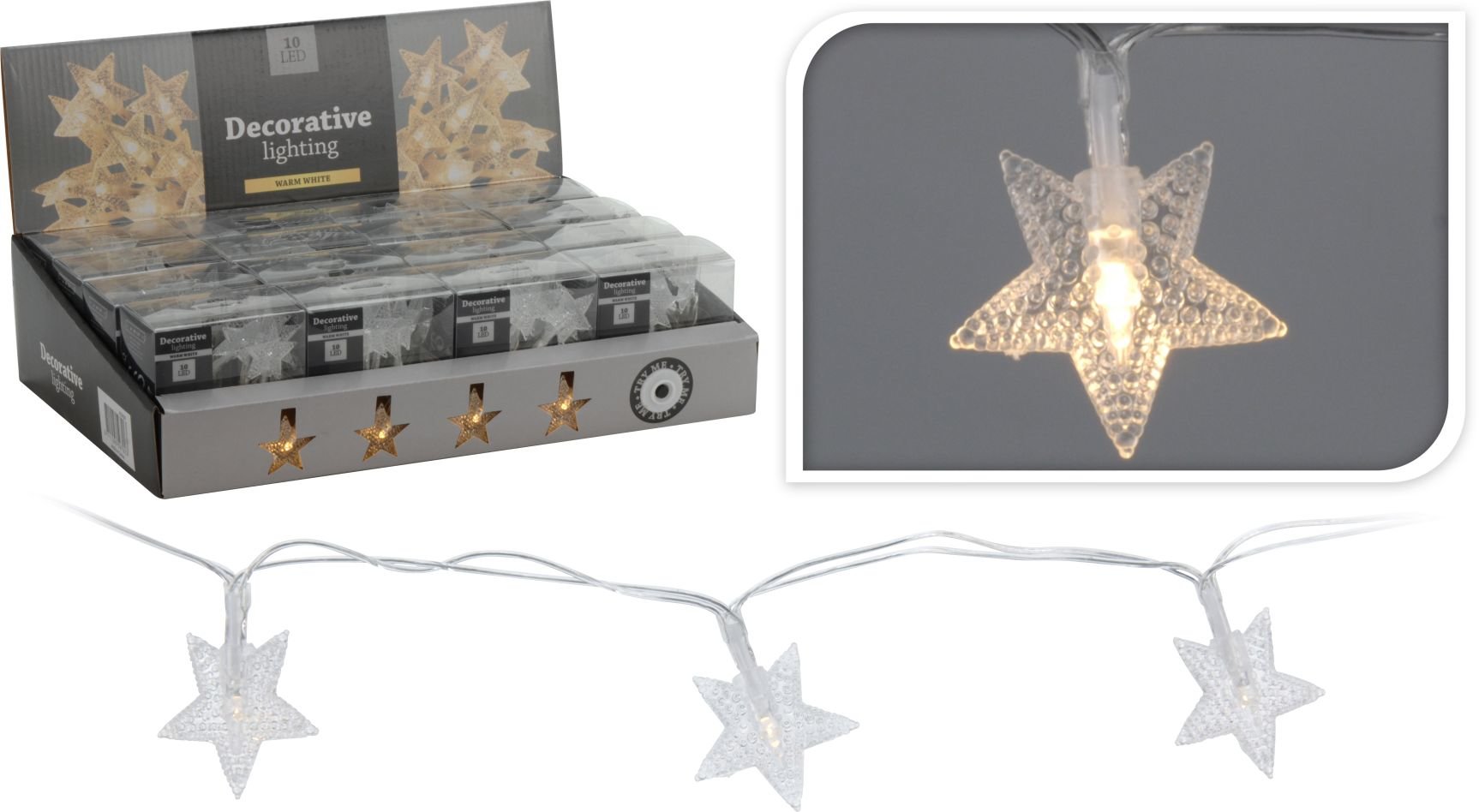 Vánoční světýlka - 10 LED žárovek v hvězdičkách. Barva žárovek - teplá bílá. Pro vnitřní použití. Rozměry - délka 130 cm (100 cm kabel se žárovkami + 30 cm přívodní kabel), průměr hvězdiček 3 cm. Baterie - 2x AA 1,5 V (nejsou součástí balení). číst celé
