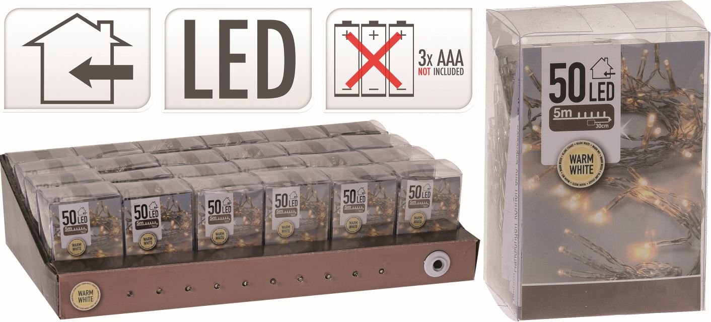 Vánoční světýlka - 50 LED žárovek, s časovačem. Barva žárovek - teplá bílá. Pro vnitřní použití. Rozměry - délka 530 cm (500 cm kabel se žárovkami + 30 cm přívodní kabel). Baterie - 3x AA 1,5 V (nejsou součástí balení). číst celé