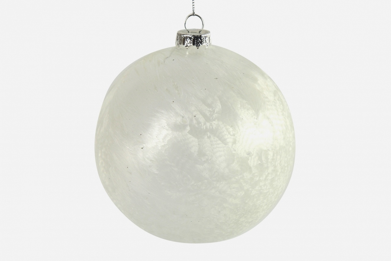Skleněná vánoční ozdoba ve tvaru koule s dekorem zmrazeného skla, která zaujme každé oko. Působí luxusním dojmem a vyniká na každém vánočním stromečku. II. jakost z důvodu červené čárky na baňce.Materiál: skloBarva: bíláVelikost: průměr 12 cm