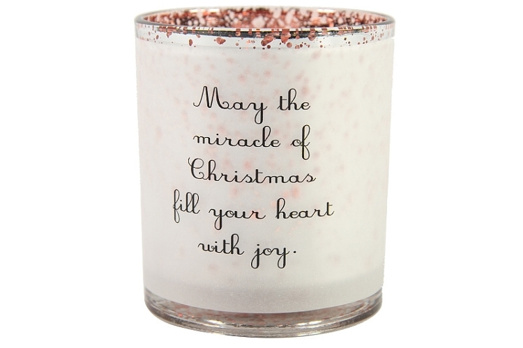 Skleněný svícen Lynej s vánočním nápisem. Vnitřní strana svícnu barva měděná, vnější bílá.