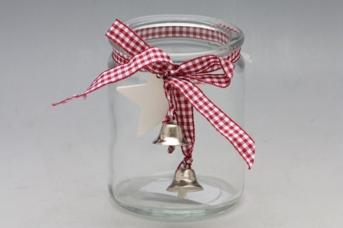 Svícen sklo s čevenou stuhou, hvězdičkou a rolničkami. Sklo: výška 10 cm, průměr 8 cm. Kat. číslo: 036 svícen sklo 710910 S