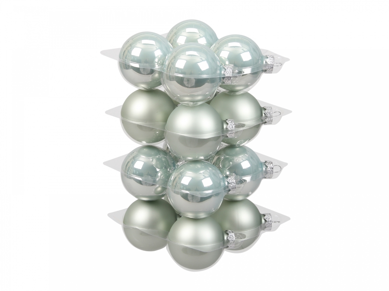 Sada 16 ks skleněných baněk v barvě oyster grey. V sadě jsou namíchané lesklé a matné baňky.