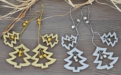 Na jednom závěsu dva stromky zavěšené na provázku s šesti rolničkama a očkem na zavěšení. V jedné sadě jsou 4 závěsy - 2x zlaté, 2x stříbrné.