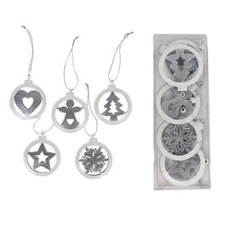 Sada kovových dekorací k zavěšení. Sada obsahuje 5 dekorací. Rozměry : 6 x 0,7 cm, výška 7 cm. Barva : kombinace stříbrná s bílou. Materiál : kov. číst celé