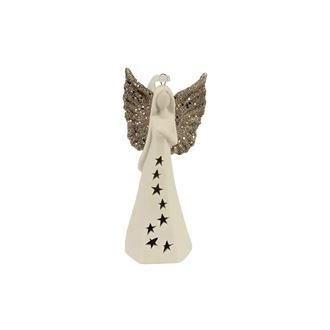 Dekorační anděl s LED osvětlením. Rozměry : 5,6 x 4,4 cm, výška 12,5 cm. Barva : kombinace bílá s champagne. Materiál : porcelán.