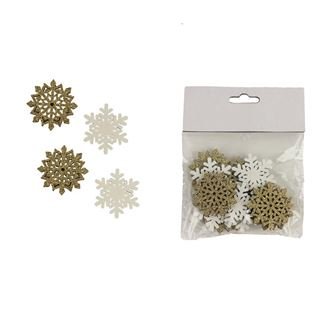 Sada dekoračních vloček s lepkou. Sada obsahuje 12 vloček. Rozměry : 3,6 cm, tloušťka 0,3 cm. Barva : kombinace bílá, zlatá. Materiál na bázi dřeva. číst celé