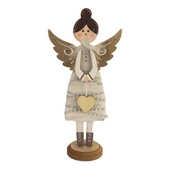 Dekorační anděl. Rozměry : 12,5 x 6,5 cm, výška 25,5 cm. Barva : kombinace bílá s hnědou. Materiál na bázi dřeva, vata.