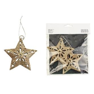 Sada dekoračních hvězdiček k zavěšení. Sada obsahuje 2 hvězdičky. Rozměry : průměr 10 cm, tloušťka 2,5 cm. Barva : zlatá. Materiál : kov. číst celé