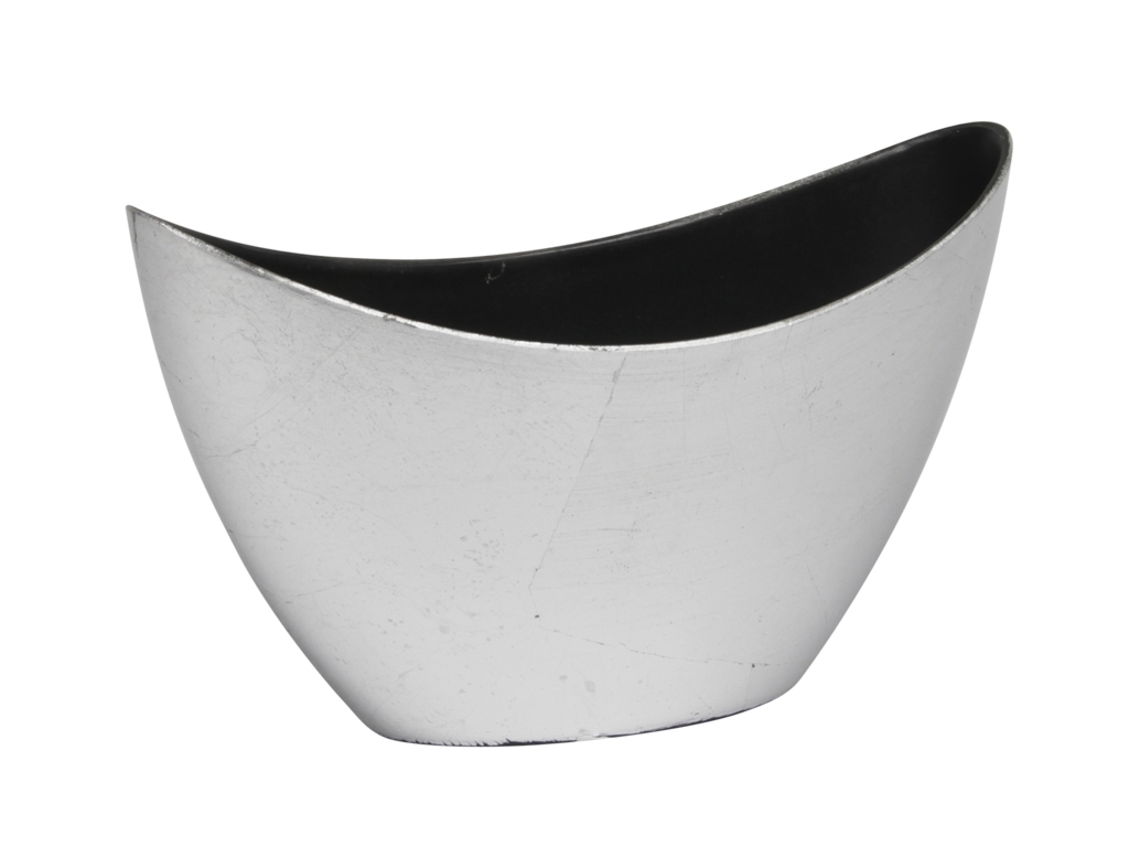 Plastový květináč ve tvaru lodičky. Tmavé skvrny na stříbrné ploše nejsou vadou výrobku.