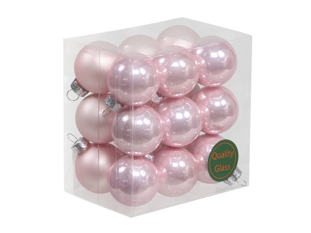 Sada 18 ks skleněných baněk v barvě powder pink. V sadě jsou namíchané lesklé a matné baňky.