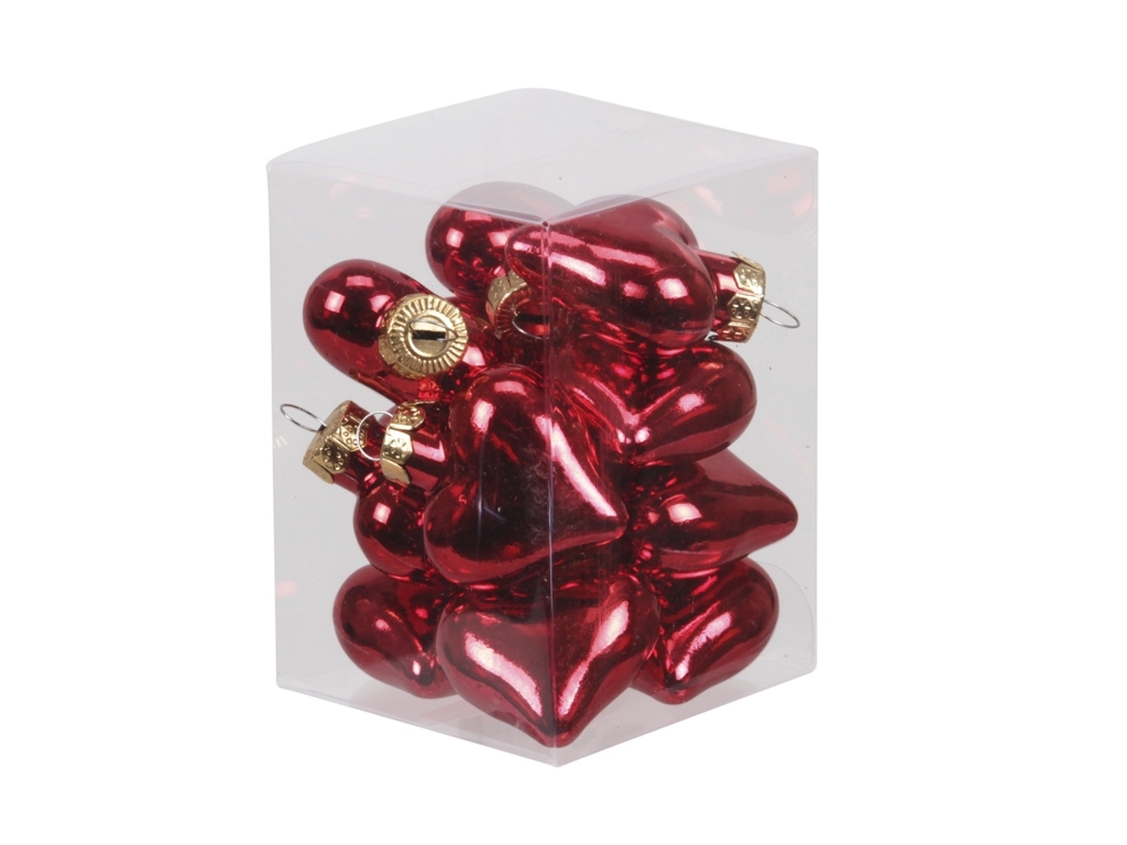 Sada 12 ks skleněných baněk - srdíček v barvě červené lesklé.