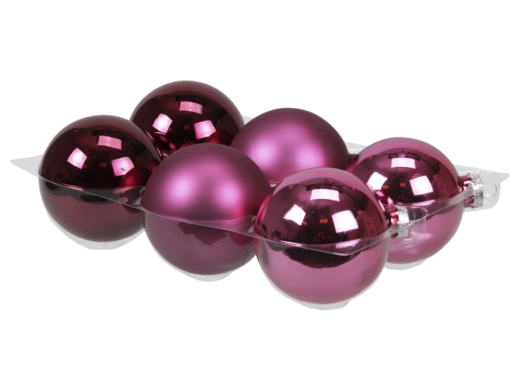 Sada 6 ks skleněných baněk vřesové barvy. V sadě jsou namíchané matné a lesklé baňky.