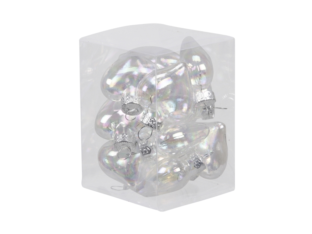 Sada 12 ks skleněných perleťových baněk - srdíček. Baňky jsou průhledné s perletí.