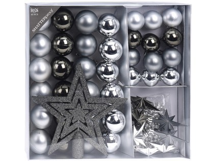 Připravte svůj domov na sváteční období s touto sadou 45 vánočních ozdob, která zahrnuje koule, špičku a další dekorace v elegantních odstínech střídavě šedé a antracitové. Tyto ozdoby vám umožní vytvořit harmonický a stylový vánoční stromek nebo výzdobu, která zaujme každého návštěvníka.